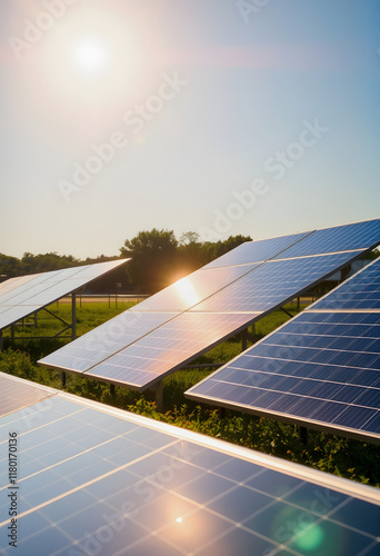 Solar panels in a field at sunset with sun flare. Renewable energy, sustainable power generation, clean electricity, golden hour