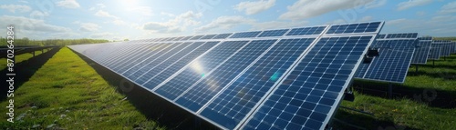 wide, shot, field, solar, panel, generate, renewable, energy, clear, blue, background, farm, planet, climate, colours, sunlight, global, reduce, clean, fossil, greenhouse, sunny, grid, friendly, power