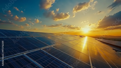 Solar panels making electricity out of sunlight under clear evening sky, environment, ESG and nature friendly clean energies