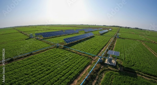 solar, panel, field, green, farm, energy, agriculture, technology, renewable, sustainable, water, irrigation, blue, pipe, system, power, clean, environmentally, friendly, rural, landscape, nature, industry, photovoltaic, sunlight, sky, bright, innovation, development, growth, solution, efficient, resource, pump, grid, farmland, future, greenfield