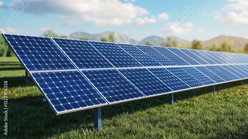 Solar panels on a green field with mountains in the background. Clean energy concept.