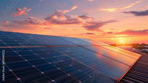 Solar panels on a house roof generating clean energy at sunset.
