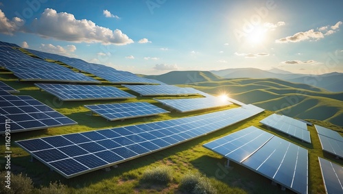 solar panel, sunrise, renewable energy, sustainability, landscape, outdoors, sun, clean energy, environmental, photovoltaic, power, electricity, nature, technology, no people, countryside, scenic, horizon, innovation, environmentally friendly, blue skies, grass, solar energy, sunlight, sustainable, power generation, renewable resources, morning