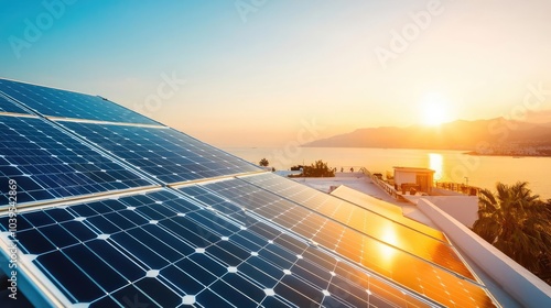 Solar panels on roof with sunset view over the ocean, vibrant colors, energy production.