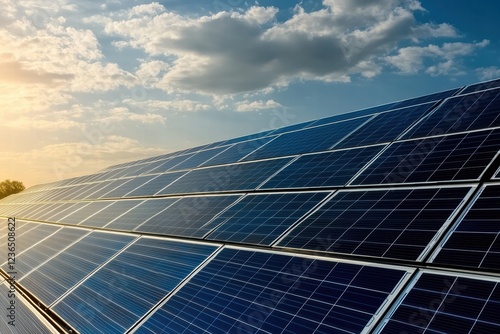 Solar panels on tinted roof reflect sunlight in a clear sky during late afternoon