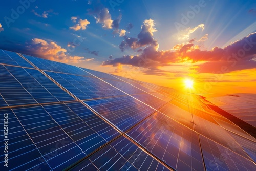 Solar panels reflecting the setting sun, a beautiful image of renewable energy.
