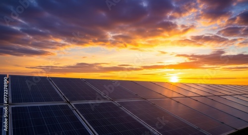 Solar panels reflecting the vibrant sunset sky, symbolizing renewable energy and sustainability
