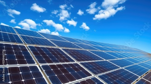 Solar Panels Under Bright Blue Sky with Clouds