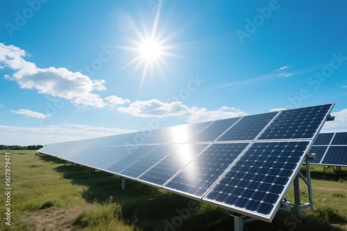 Solar panels under sunlight, representing clean energy and sustainable technology in a simple landscape
