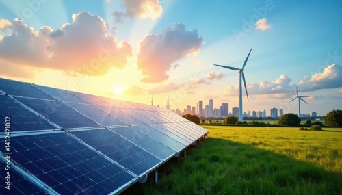 Solar panels, wind turbine, high-voltage tower, city skyline, clean energy , alternative energy, horizon