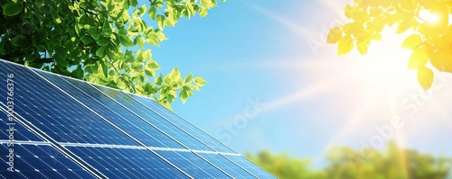 Solar panels with sunlight and greenery in the background.