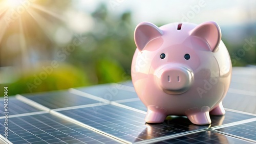 Solar Power Investment - Piggy bank on solar panels, with a gently blurred nature background.