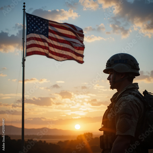 Soldier and USA Flag on Sunrise Background: Honoring Veterans Day