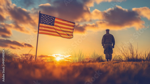 Soldier Holding American Flag Against Sunrise, Reflecting Patriotism and Honor
