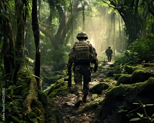 soldier, green, army, with, military, equipment, jungle, special, walk, back, view, concept, warfare