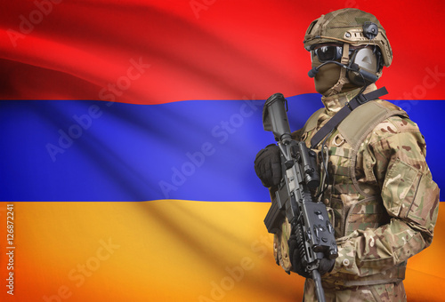 Soldier in helmet holding machine gun with flag on background series - Armenia