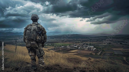 military, view, panorama, horizon, uniform, nature, vigilance, terrain, duty, huge, helmet, calmness, protection, camouflage, observation, scenery, position, peace, battle, landscape, warrior, mountain, vale, lookout, wilderness, discipline, sky, serenity, sunset, watchful, sentinel, contemplation, guard, ground, soldier, viewpoint, isolation, caution, height, path, perspective