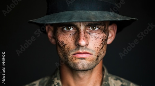 soldier, military, army, camouflage, uniform, hat, face, portrait, serious, intense, determined, sharpened, eye, man, male, military service, combat, war, duty, courage, patriotism, bravery, strength, defense, protection, military man