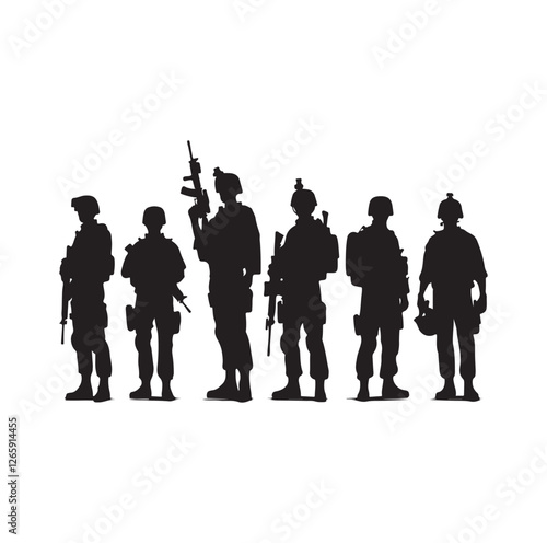 silhouette, vector, design, soldier, military, army, combat, warrior, tactical, battle, infantry, commando, sharpshooter, rifle, weapon, gear, helmet, vest, boot, camouflage, war, conflict, defense, attack, operative, stealth, mission, bravery, honour, courage, hero, veteran, shadow, black, white, contrast, minimal, modern, sharp, detailed, powerful, strong, fearless, patriotic, uniform, badge, rank
