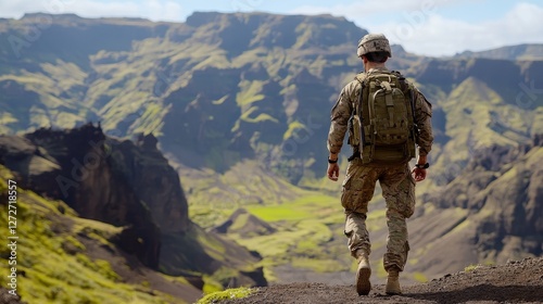 soldier, military, army, mountain, landscape, scenery, view, vista, rugged, terrain, hill, vale, wilderness, nature, travel, adventure, exploration, expedition, camouflage, uniform, backpack, gear, equipment, helmet, boot, path, trail, rocky, desolate, remote, green, brown, grey, sky, sun, day, horizon, distance, perspective, alone, freedom