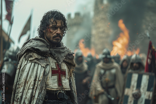 soldier with a sword, a gun. A fierce battle between a knight in shining armor and a fire-breathing dragon atop a castle tower. Creative art