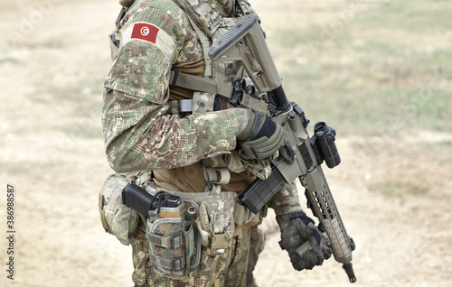 Soldier with assault rifle and flag of Tunisia on military uniform. Collage.
