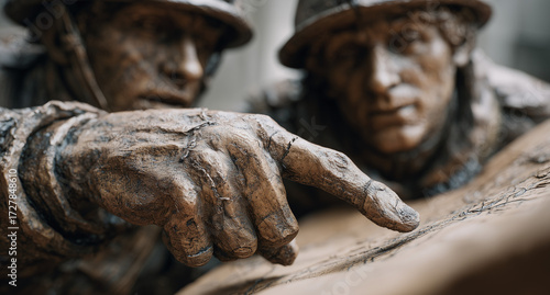soldier, historical building, sculpture, battlefield, teamwork, discussion, history, camaraderie, art, bronze, military, dedication, war, memorial, emotion, figure, detail, craftsmanship, communication, heritage, remembrance, story, closeup, soldierly, interaction, technique, design, realism, culture, tribute, installation, creativity, artistry, loyal, heroism, honour, patriotism, purpose, narrative, oneness, peace, generative, ai