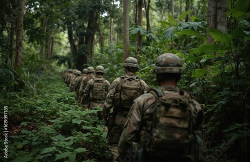 Soldiers in camouflage gear march single file through dense, green jungle. Formation, equipment suggest prepared military operation, emphasizing teamwork, discipline within natural, wild environment.