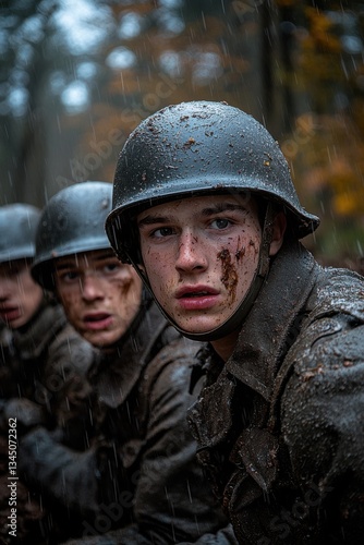 soldier, rain, trench, forest, battle, young men, helmet, military, fighting, camaraderie, environment, teamwork, survival, mood, nature, hardship, conflict, emotion, bravery, history, wartime, determination, landscape, solidarity, perseverance, youth, resilience, duty, struggle, hope, fear, connection, freedom, sacrifice, challenge