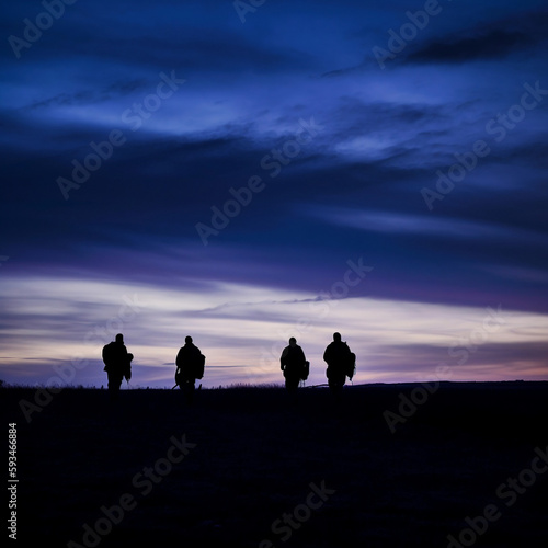 Soldiers walking at dusk silhouette, their forms fading into the darkening blues and purples of the sky. The peaceful serenity of the evening is juxtaposed with the gravity of their situation.