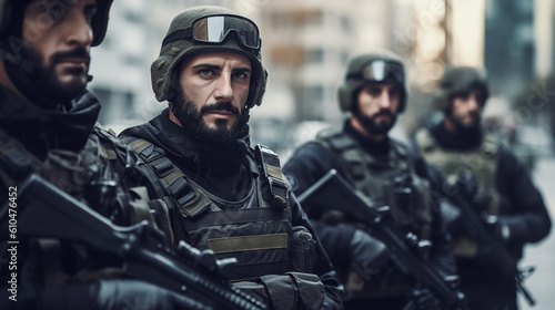 Soldiers with caps and goggles and machine guns in a residential town, wearing protective clothing and bulletproof vests, full beard