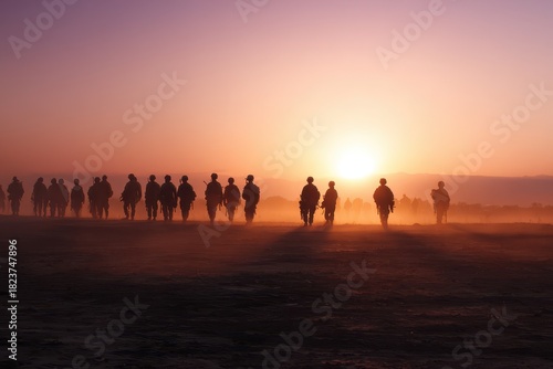 silhouette, soldier, sunset, horizon, military, field, line, backlight, shadow, dusk, marketing, dust, colours, group, cloud, pink, warm, dramatic sky, stock, rugged, dramatic, concept, landscape, calm, troop, silhouette, gear, editorial, composition, solemn, warmth, army, glow, evening, terrain, light, purple, nature, mood, sky, photo, atmosphere, orange, gold