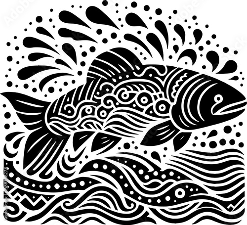 Solid Black Silhouette of Salmon Fish in Iconic Traditional Mexican Style