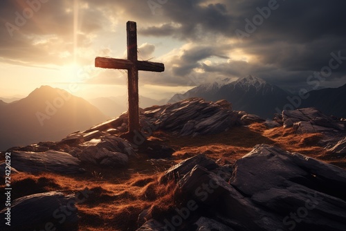 solitary cross on a rock in a cloudy mountain landscape at sunset