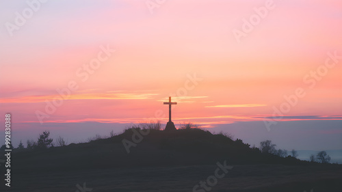 cross, hill, dawn, sunrise, faith, christianity, sacrifice, hope, renewal, spiritual, calm, landscape, morning light, peace, devotion, symbolism, religious, sky, colours, solitude, worship, reverence, nature, light, holy, contemplation, sacred
