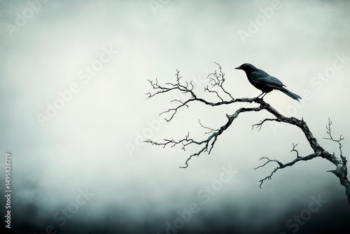 Solitary Crow on Bare Branch Against Textured Gray Background