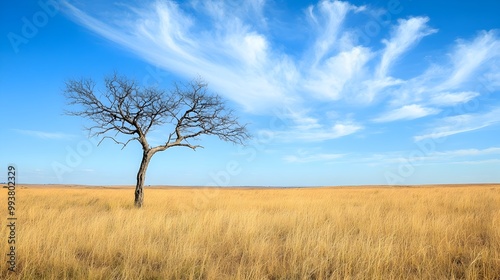 Solitary dry tree standing tall in a vast grassy field with its bare branches reaching towards the bright blue sky surrounded by golden grass swaying gently in the breeze