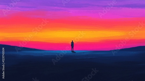 Solitary Figure Against Vibrant Sunset Landscape with Color Gradient