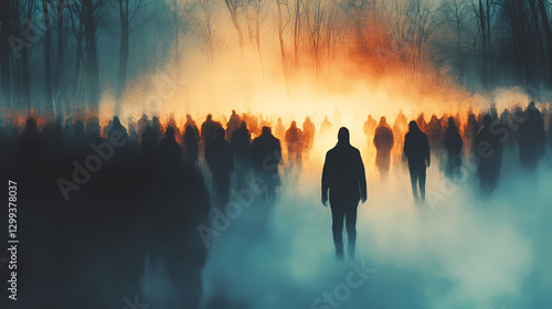 solitary, figure, stand, crowd, blurred, people, misty, aethereal, environment, image, theme, isolation, loneliness, social, alienation, making, ideal, solitude, forest, illustration