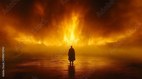 Solitary figure facing immense fiery spectacle