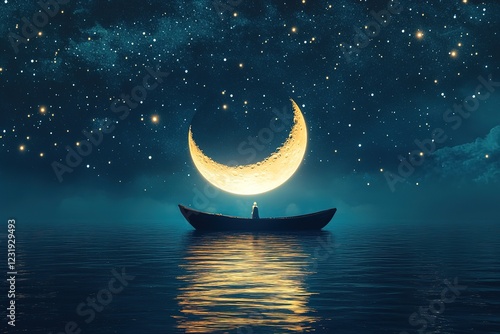 moon, night, star, boat, sea, ocean, water, sky, crescent moon, moonlight, solitude, calmness, peaceful, dreamlike, fantasy, imagination, artistic, digital artwork, illustration, calm, adventure, travel, journey, poster, wallpaper, spiritual, meditation, inspiration, romantic, voyage, landscape, digital, design, dark, blue, yellow, gold, closeup, contemporary, peace, mystic, minimalism, vintage