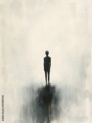 Solitary Figure in Misty Landscape: Abstract Painting of Isolation, Loneliness, and Introspection