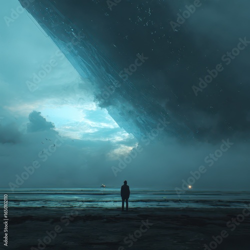 beach, figure, solitary, ocean, sea, sky, cloud, structure, massive, imposing, teal, blue, dark, silhouette, water, shore, coast, landscape, horizon, light, bird, futuristic, science fiction, alien, ship, unknown, mystery, surreal, digital artwork, artwork, illustration, concept, design, fantasy, imagination, creative, artistic, mood, atmosphere, dramatic, scenic, seascape, coastline, nature, outdoors, twilight, evening, night, dreamlike