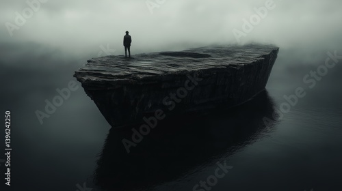 solitary figure standing on a small, rocky island surrounded by calm water. The scene is moody and atmospheric, with a dark sky and muted colors