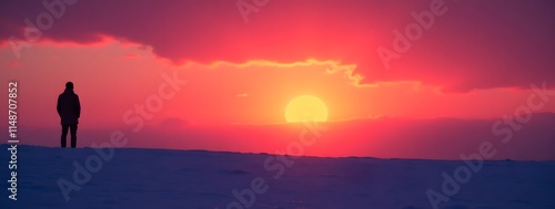 sunset, solitary, figure, snowy, landscape, silhouette, vibrant, horizon, sky, cloud, dusk, evening, outdoors, nature, peaceful, serene, scenic, colourful, twilight, shadow, dramatic, person, male, standing, winter, cold, calm, red, orange, purple, blue, tranquil, beauty, peacefulness, quiet, solitude, atmosphere