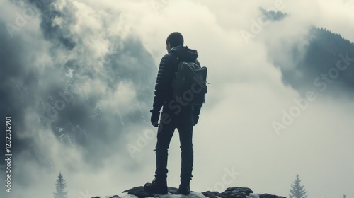 hiker, mountain, fog, mist, cloud, backpack, adventure, exploration, journey, travel, landscape, nature, scenic, view, silhouette, man, person, lone, solitary, serenity, calm, peaceful, mystery, dramatic, atmospheric, grey, blue, cold, winter, snowy, tree, conifer, peak, summit, rock, cliff, wild, wilderness, immensity, horizon