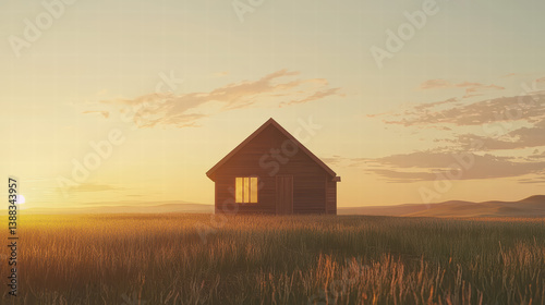 Solitary House in Sunset: A serene and isolated cabin stands peacefully in the middle of a vast field at dusk. The soft light from the setting sun bathes the scene in warmth.