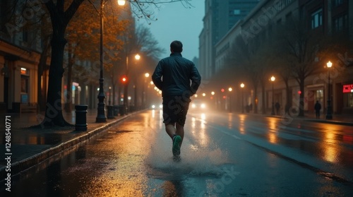 Solitary Jogger in a Desolate City Rain