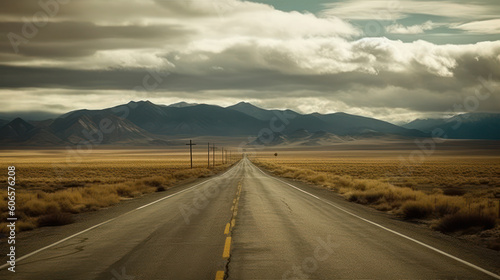 Solitary Passage: A Desolate Road Cutting Through an Unforgiving Landscape. Generative AI
