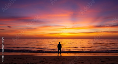 Solitary Silhouette on the Shore: A lone figure stands on the sandy beach, gazing out at the fiery hues of a majestic sunset over the tranquil ocean, a moment of introspection and serenity.Silhouette